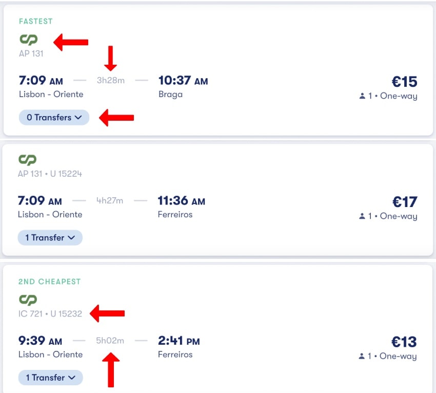 When looking at potential train tickets, it’s super important to pay attention to both the type of train (AP high-speed, Intercity, local/regional, etc.) and the number of changes (direct, one change, two changes, etc.).