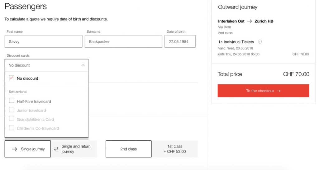 Important! Beware when looking at ticket prices on www.sbb.ch because they automatically assume you’re using a half-fare travel card (which most Swiss citizens have). You must click “no discount” in the “Discount Card” drop-down menu. See below: