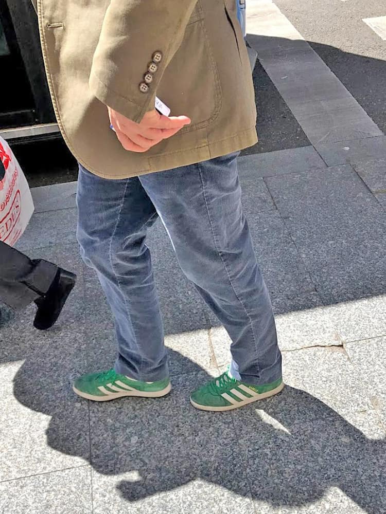 This middle-aged guy was rocking some classic green Adidas with jeans and a sports coat.